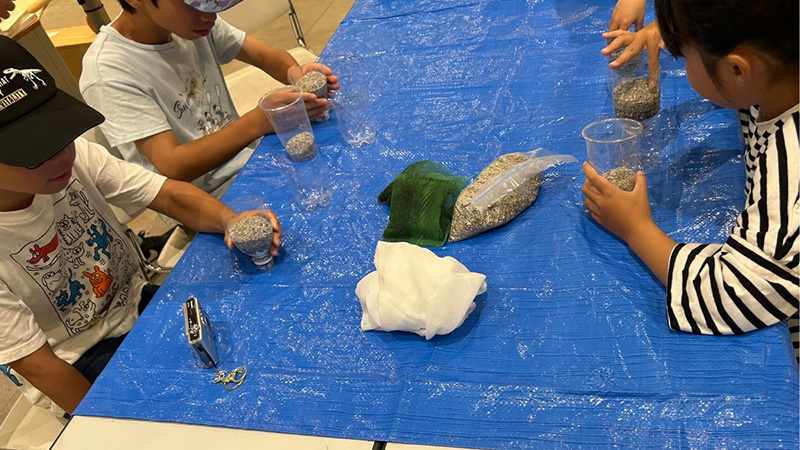 ペットボトルにカット綿・小石・砂利・炭・砂・ガーゼといった身近な素材を詰め、泥水をろ過する体験を実施しました。繰り返し挑戦しながら水が澄んでいく様子に子どもたちは夢中に。災害時に「きれいな水」がどれほど貴重かを実感するとともに、実際には煮沸などの追加処理が欠かせないことも学びました。